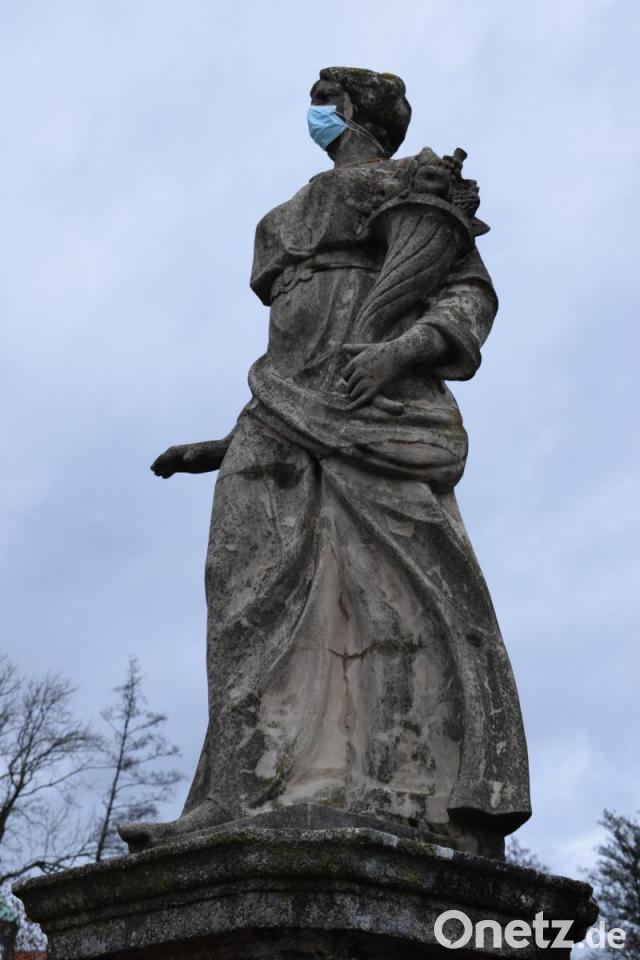 Die beiden Göttinnen-Figuren Ceres und Justitia thronen erst seit Anfang 1900 über der Fischhofbrücke. Auch sie mussten sich an die Corona-Zeit anpassen. Pünktlich zu Beginn des "Lockdown Light" am Montag erhielten die Göttinnen über Nacht ganz regelkonform einen Mundschutz. Ceres, abgebildet mit einem Füllhorn, ist die römische Göttin des Ackerbaus, der Fruchtbarkeit und der Ehe. Ebenso gilt sie als Gesetzgeberin. Auf der anderen Seite der Brücke wacht Justitia, römische Göttin der Gerechtigkeit und des Rechtswesens, über den Weg zum Amtsgericht.