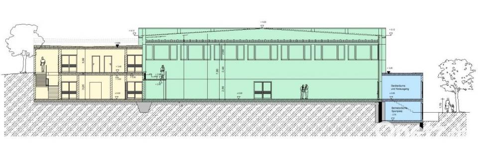 Die 46 mal 46 Meter große neue Sportstätte würde mit einem Steg ans Gymnasium angebunden. Auch gibt es einen Aufzug für barrierefreien Zugang. Die Tribüne sei für 150 Personen ausgelegt. Im Obergeschoss entstehe eine Art "vierte Turnhalle" mit Boulder- und Konditionsraum.