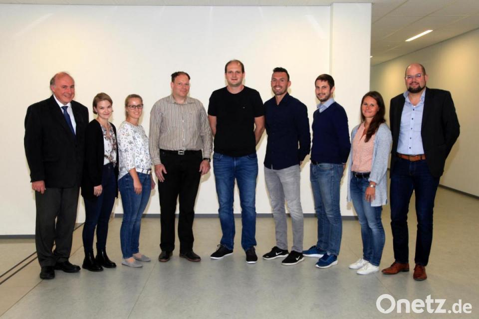 Schulleiter Georg Hecht und Personalratsvorsitzender Tobias Lang begrüßten die Neuzugänge im Lehrerkollegium: Jennifer Schmid (Deutsch, Geschichte, Sozialkunde), Maria Treimer (Mathematik, Wirtschaft/Recht), Wolfram Wanninger (Deutsch, Geschichte), Axel Astner (Wirtschaft/Recht, Geographie), Martin Vesenjak (Katholische Religion, Sport), Philipp Götz (Deutsch, Sport) und Kathrin König (Deutsch, Sport).