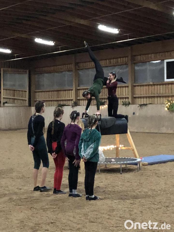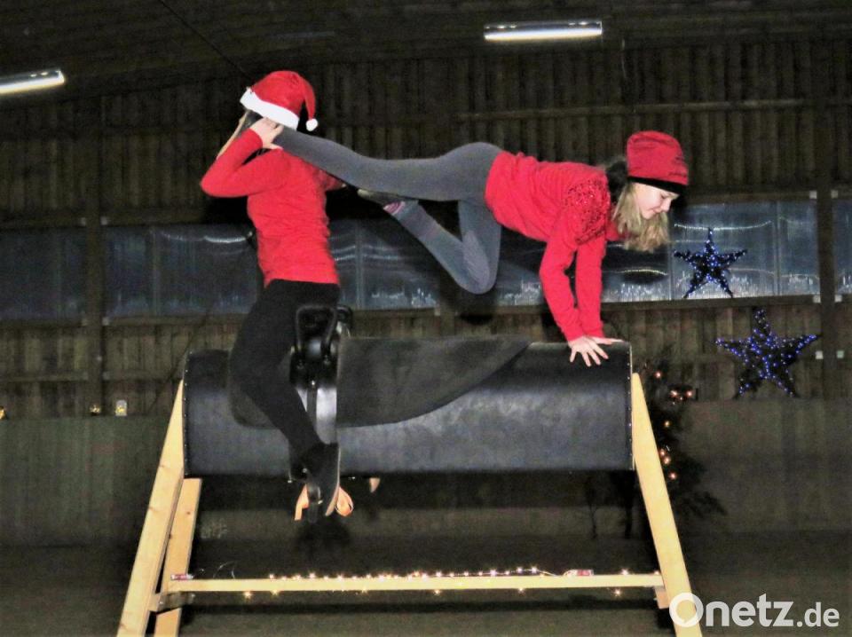 Natürlich nutzte der Reitverein die Feier auch dazu, den Gästen die Arbeit mit den Pferden zu zeigen. Zwar waren am Abend keine lebendigen Vierbeiner vor Ort. Aber die Zuschauer bekamen mit Vorführungen der Voltigier-Gruppe "Nachwuchs und Turnier" auf den Holzpferden einen interessanten Eindruck, wie die Jugendlichen übers Jahr trainieren.