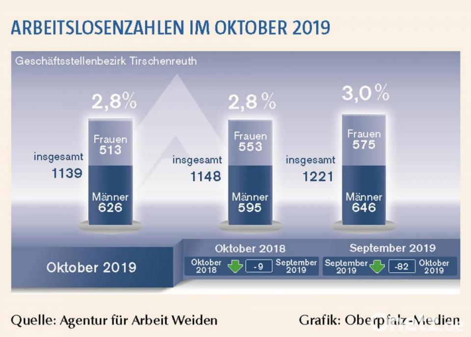 Der Arbeitsmarkt im Landkreis Tirschenreuth war im Oktober weiter stabil. Mit einer Arbeitslosenquote von 2,8 Prozent gab es den gleichen Wert wie im Oktober 2018. Die Konjunkturlage war weiter gut, die Zahl der Arbeitslosen sank auf 1139.