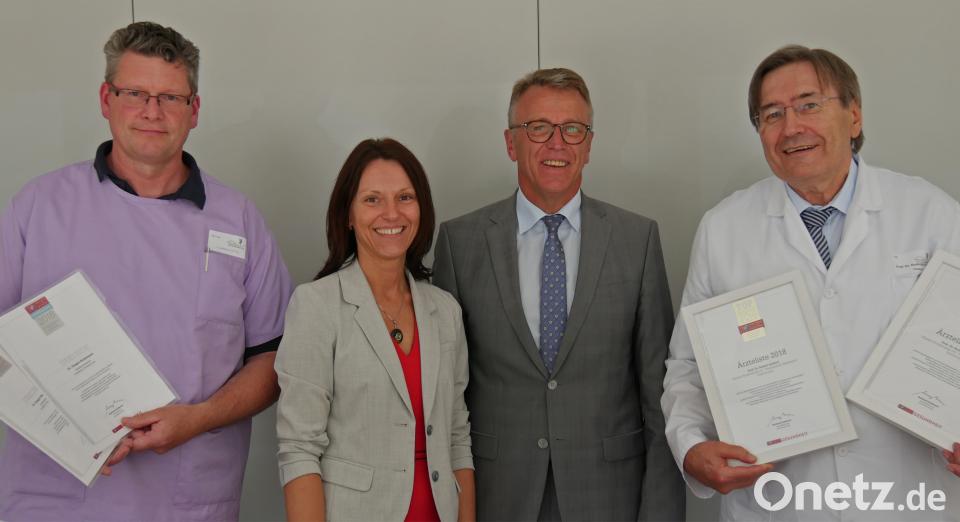 Dr. Gregor Stohlmann für seine Leistungen als Anästhesist und Palliativmediziner. Beide Ärzte seien darüber hinaus auch verantwortlich für die Intensivbetreung, die genauso wesentlich für die Genesung sei, erklärte Krankenhausleiterin Claudia Kost. Die hochwertig ausgestattete Intensivstation und das Endoprothetikzentrum der Maximalversorgung mit seinem Leiter Professor Ascherl, bezeichnete sie als besonderen Gewinn. Gregor Stohlmann, freute sich besonders, dass Anästhesie und Palliativmedizin einmal als preiswürdig wahrgenommen wurden und lobte das persönliche Engagement des Teams innerhalb der Intensivmedizin. "Patienten und Familienmitglieder können jederzeit kommen oder anrufen, sie werden immer ein offenes Ohr finden, ob bei Ärzten oder Pflegepersonal, deshalb ist das eine Auszeichnung der gesamten Abteilung."