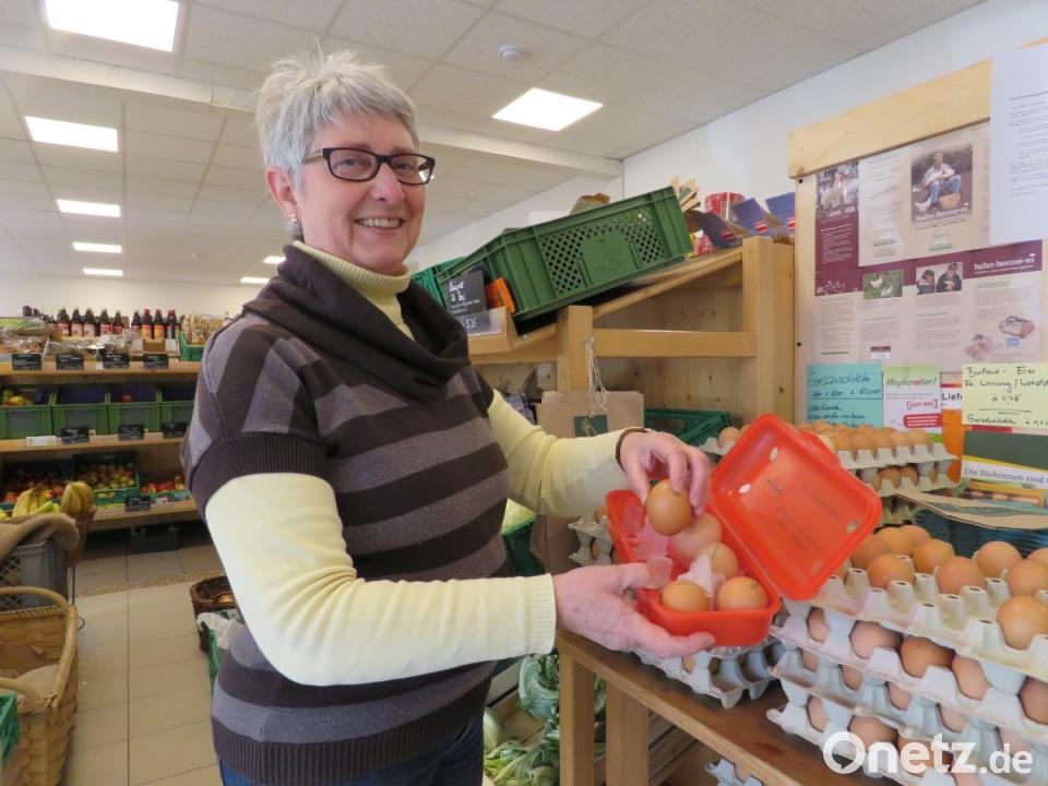 Auch der Bioladen "Frohnatur" von Roswitha Ullrich kämpft gegen den Verpackungswahn. Obwohl die Eierschachteln aus Pappe recht umweltfreundlich sind, gibt es im Bioladen sogar eine Mehrweg-Eierschachtel aus hochwertigem Kunststoff. Eher selten findet man Ein-Liter-Wein und Essig in Pfandflaschen. Im Bioladen gibt es das. Verkäuferin Andrea Altrock faltet einen luftigen Gemüse-Stoffbeutel auseinander, handlich ist er und für jede Handtasche geeignet. "Der ist ein Renner. Wir bestellen ständig welche nach", freut sie sich über das Kundeninteresse. Ansonsten hängen neben Obst und Gemüse kostenlose Papiertüten. Streng ist der Bioladen bei sinnloser Ressourcen-Verschwendung: Kaffeekapseln gab es hier nie. Und "Coffee to go" werde ganz eingestellt, sagen Sibylle Killinger und Andrea Altrock. Für Oliven, Käse, Tee, Gewürze und mehr stehen Pfandgläser auf der Theke. Im Biobereich sei der Handel sowieso mehr auf Müllvermeidung eingestellt, erklären die Frauen.