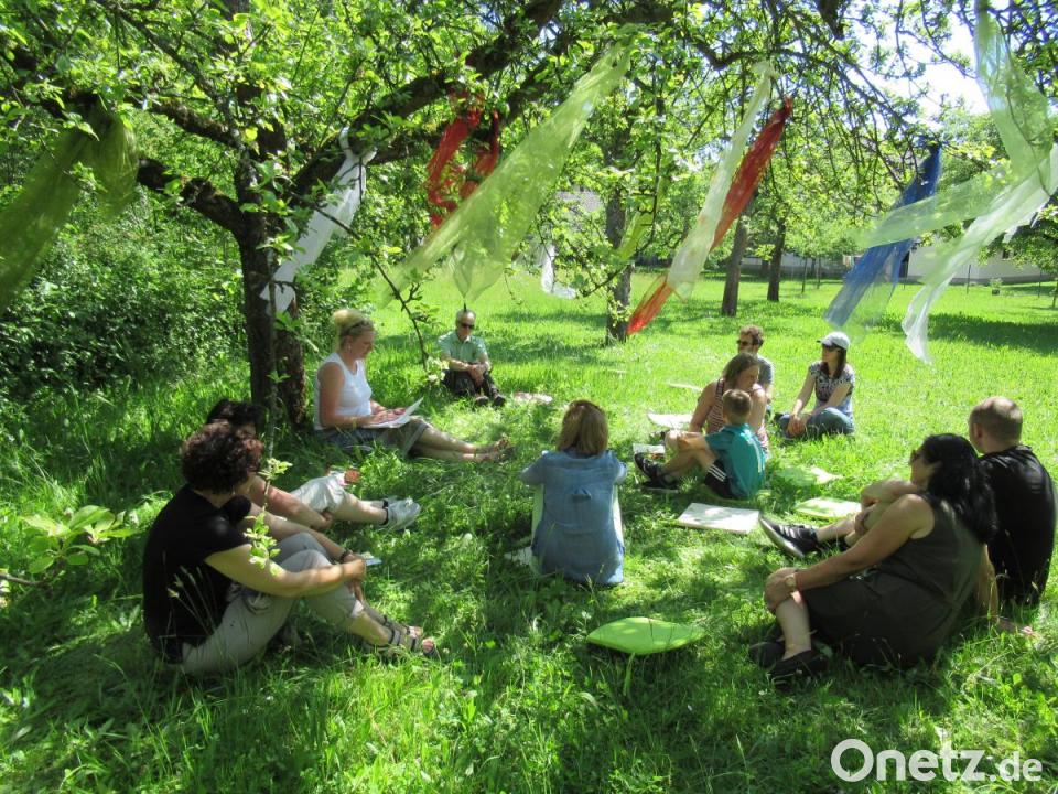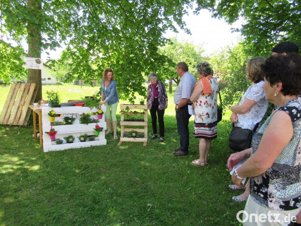 Die Kräuterführerinnen Claudia Müller und Christa Hemann beantworteten alle Fragen und hatten auch Kostproben verschiedener Früchte dabei. Das ist für Kinder zu langweilig, dachte sich Rita Fenzl und hatte Sonnenblumen zum Säen oder Pflanzen dabei. Jedes Kind konnte sich eine eigene Blume mitnehmen. Unter der großen Linde stellte Diana Petrik in einer Präsentation vor, wie bei einer Paletten-Bepflanzung auf kleinstem Raum ein schöner Raumteiler entsteht. Die Besucher staunten über die Vielfalt des Gartens und das Wissen der Referentinnen aus dem Gartenbauunterricht.
