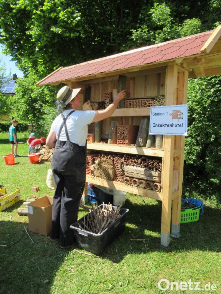 Sabine Grillmeyer und Simone Schuller leiteten die Besucher an. Die Gäste sägten. bohrten und schmirgelten. Alle hatten Spaß am Gestalten und Einfüllen in das vorbereitete Haus. Dabei wurden bereits die ersten Insekten gesichtet, wie sie die Röhren und Bohrlöcher inspizierten. Danach war Entspannung angesagt. Unter dem großen Apfelbaum gab es Kissen zum Sitzen und ein Kräutermärchen zum Träumen wurde vorgelesen. Wer lieber den Garten erkunden wollte, konnte bei einer Führung durch verschiedene Bodenbepflanzungen, essbare Wildkräuter und Früchte sowie die neue automatische Bewässerungsanlage des Schulgartens entdecken.