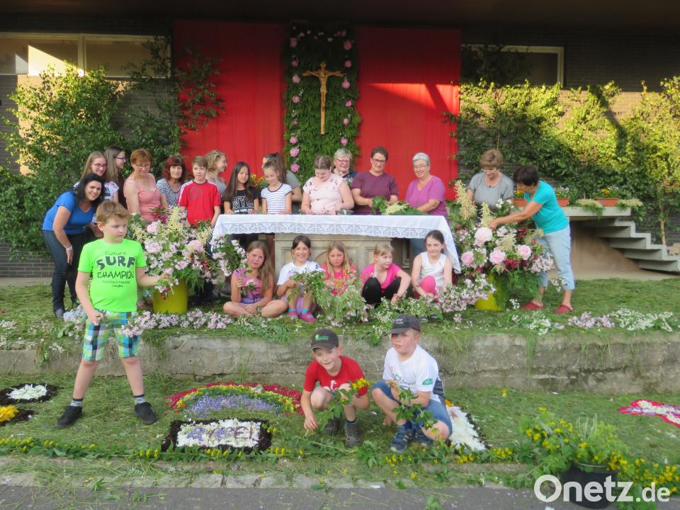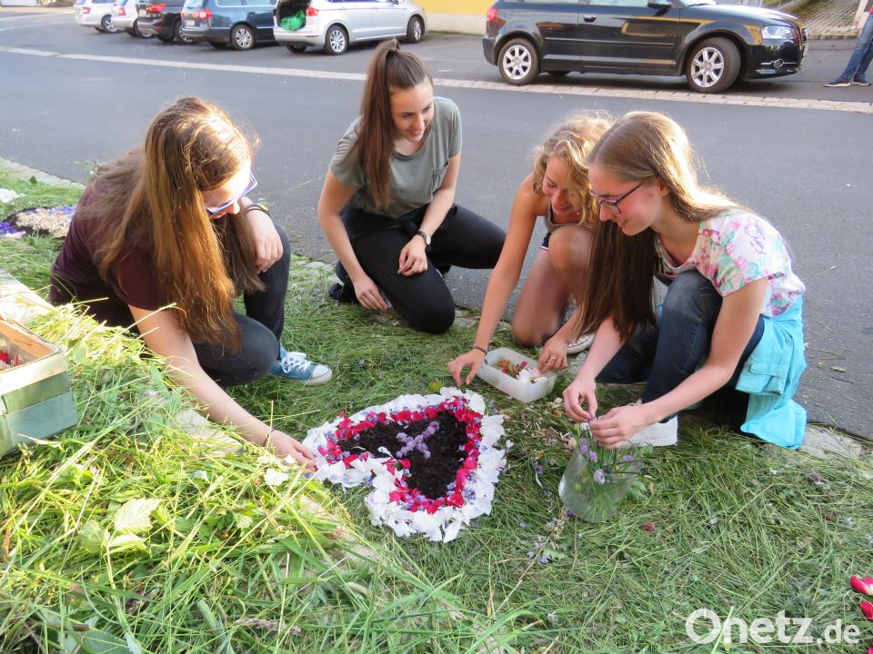 Das Hochfest der Katholiken findet immer zehn Tage nach Pfingsten statt. Diesmal spielte das Wetter auch schon am Vortag mit - gut für unzählige Mitglieder der Pfarrgemeinden. Deren Aufgabe war es, am Mittwochabend und am frühen Donnerstagmorgen die Außenaltäre mit Blumenteppichen für die Prozessionen vorzubereiten.