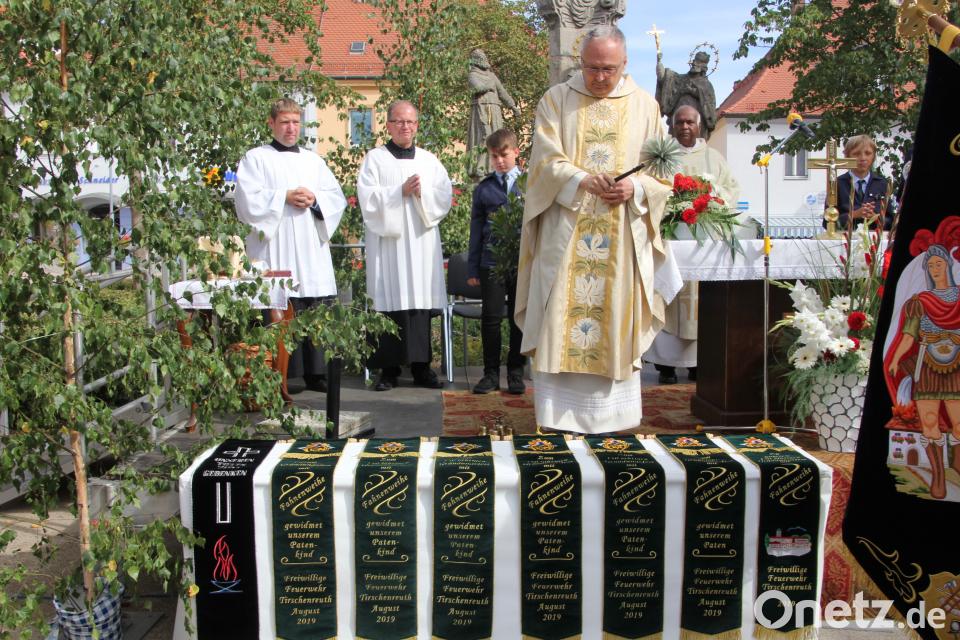 Nach der Predigt erfolgte die Weihe der neuen Vereinsfahne, die sich die Tirschenreuther Wehr zum 150. Geburtstag neu angeschafft hat. Gesegnet wurden auch die Fahnenbänder für den Patenverein aus Waldsassen und jene für die fünf "Patenkinder" aus Erbendorf, Bärnau, Plößberg, Liebenstein und Wondreb.