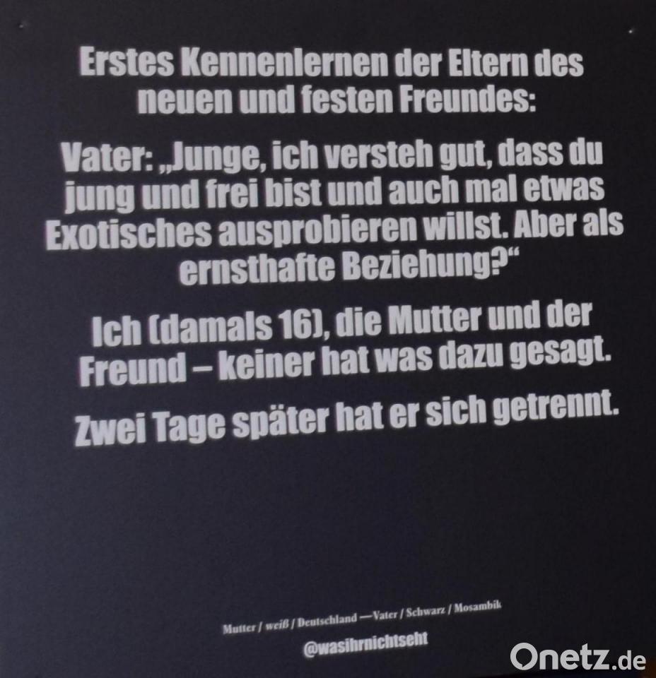 Abgesehen von der "Mitte auf dem Marktplatz" könnte die Wanderausstellung auch nirgendwo besser präsentiert werden als in einer Buchhandlung. Denn: In der Präsentation geht es um Worte. Worte, die täglich bewusst oder unbedacht ausgesprochen werden. Worte, die andere Menschen verletzten können. Worte, die viele Leute gedankenlos aussprechen, meist ohne viel darüber nachzudenken, dass sie sich eben rassistisch verhalten. Auf etwa 24 schwarzen Tafeln stehen in weißer Schrift solche Sprüche, Geschichten und Worte. Diese sollen den Betrachter oder Leser sensibilisieren gegen Alltags-Rassismus.