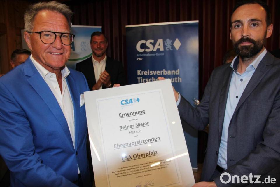 Der ehemalige CSU-Bundestagsabgeordnete Reiner Meier aus Tirschenreuth, der 20 Jahre Bezirksvorsitzender der Arbeitnehmer-Union (CSA) war, wurde bei der Bezirksversammlung im Gasthof „Zur Alm“ in Tirschenreuth einstimmig zum CSA-Bezirksehrenvorsitzenden ernannt. Zuvor gab Meier einen Rückblick in seine Zeit als Bezirksvorsitzender, in der "vieles bewegt werden konnte", wie die Mütterrente oder der Mindestlohn. Die Kernaufgabe der CSA sei aktuell eine grundlegende Rentenreform.