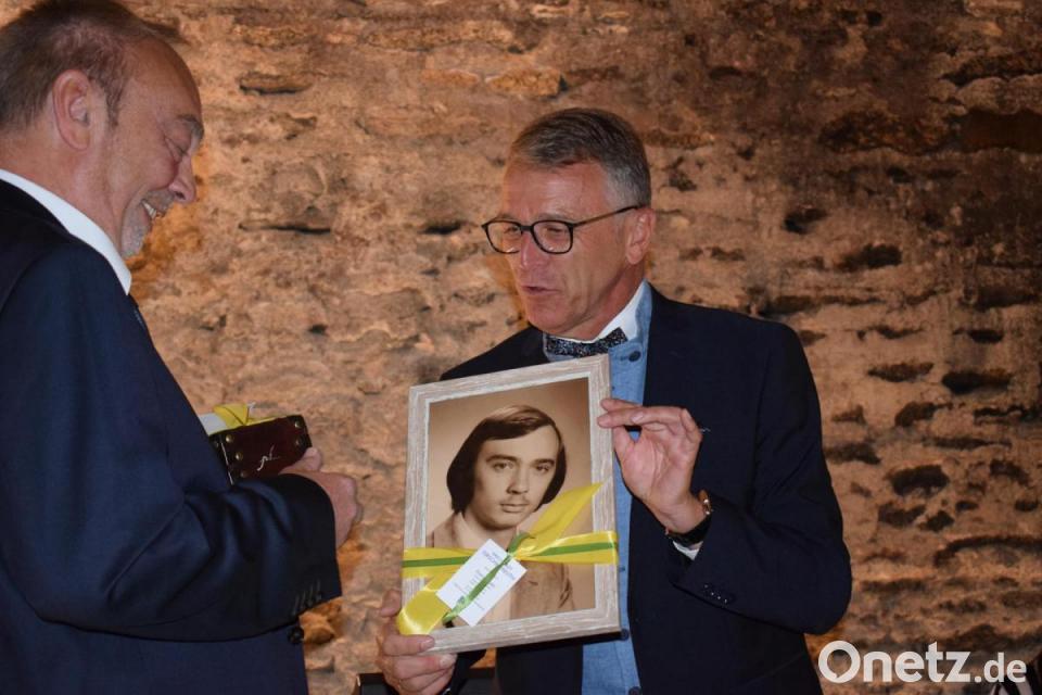 Zum Abschied überreichte Stahl einen Büchergutschein - "für eine Stadtchronik", scherzte der Rathauschef, weil sich Geyer auch um die neue Chronik der Stadt bemühte. Außerdem gab es eine kleine Truhe voller "Peter-Geyer-Pensions-Tropfen", bestehend aus vielen kleinen Probierfläschchen, gefüllt mit Gin. Dazu erhielt Geyer zum Abschied ein gerahmtes Porträt von sich selbst, aus dem Jahr, in dem er bei der Stadt seine berufliche Karriere begann.