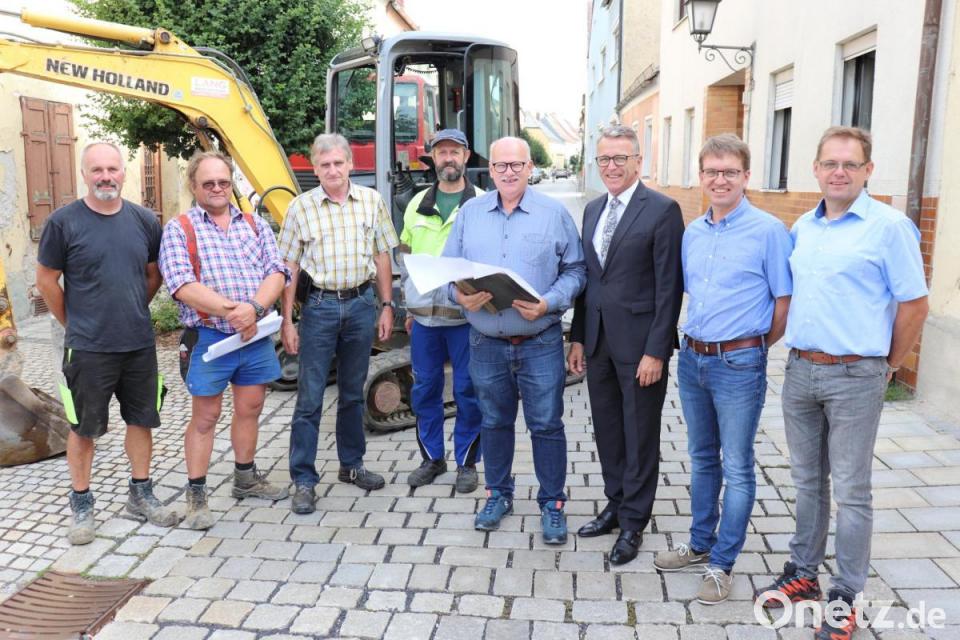 Gaben den Startschuss für die Baumaßnahme: Mitarbeiter Jiri Podhorsky und Vorarbeiter Gerhard Schreiber von Ziegler Tiefbau, Stadtwerke-Wassermeister Hermann Birkner, Stv. Stadtwerke-Wasserwart Dieter Gleißner, Bernhard Kaltenecker vom Büro Zwick-Ingenieure, Bürgermeister Franz Stahl, Stadtbaumeister Andreas Ockl und stellvertretender Stadtwerke-Leiter Berthold Zeitler (von links) beim Startschuss der Bauarbeiten.