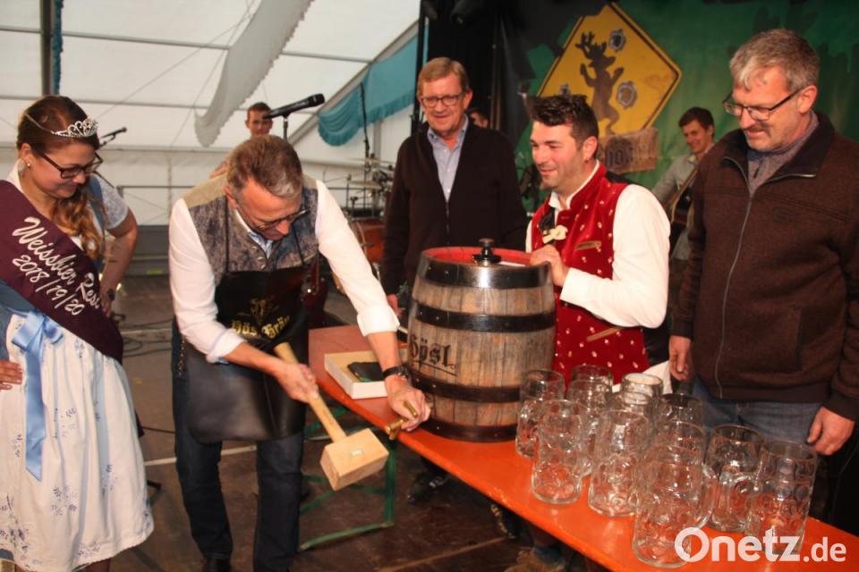 Das lag wohl daran, dass der Hahn anfangs nicht so richtig saß. Doch Franz Stahl brachte den Zapfhahn schließlich im Fass unter, auch wenn das Holzfass danach zum Teil etwas leckte. Bei der Eröffnung mit dabei waren zudem Dritter Bürgermeister Norbert Schuller, „Weißbier-Resi“ Martina Bleistein, Festwirt Daniel Feuerer und Georg Duschinger, der das Volksfest organisiert (von links). Nach dem Abzapfen hallte ein Prosit der Gemütlichkeit durch das Festzelt, ehe sich alle Gäste das Hösl-Bier aus der Nachbarstadt Mitterteich schmecken ließen.Ein Prosit der Gemütlichkeit auf ein friedvolles Volksfest, von links Norbert Schuller, Franz Stahl, die „Weißbier-Resi“ Martina Bleistein, Daniel Feuerer und Georg Duschinger.