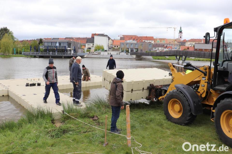 Mit schwerer Technik und vielen Helfern fügte Fischhofpark-Fördervereinvorsitzender Vinzenz Rahn in dieser Woche am Ufer des Unteren Fischhofparkteiches 23 Einzelteile zu einer 140 Quadratmeter großen Pontonplattform zusammen.