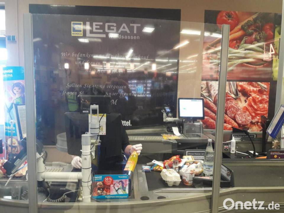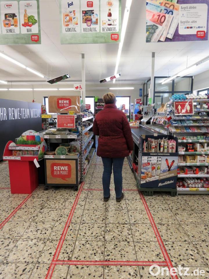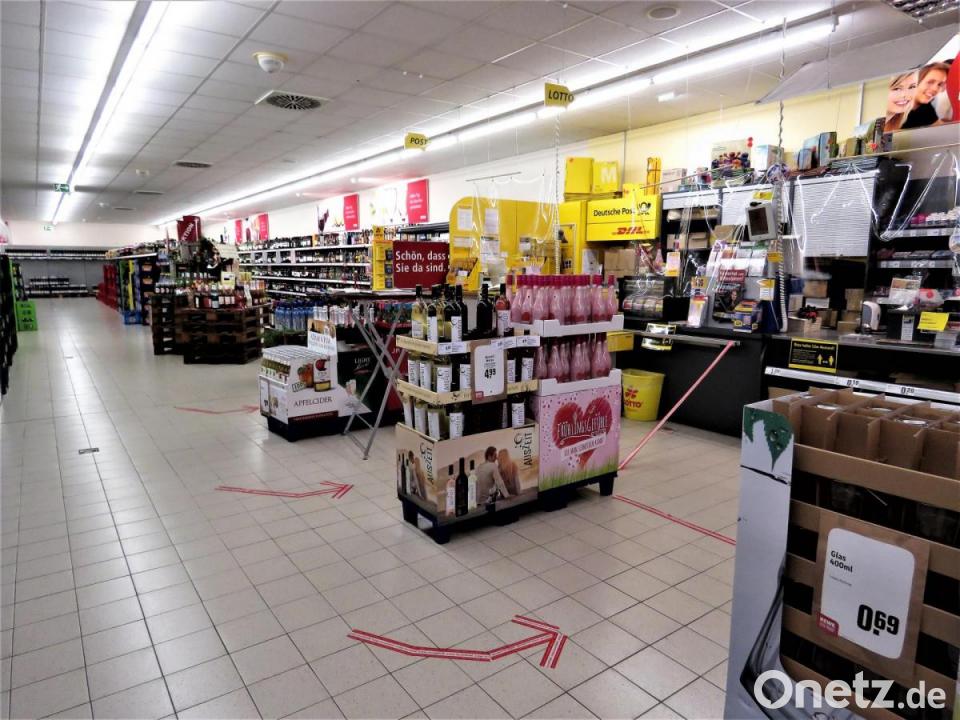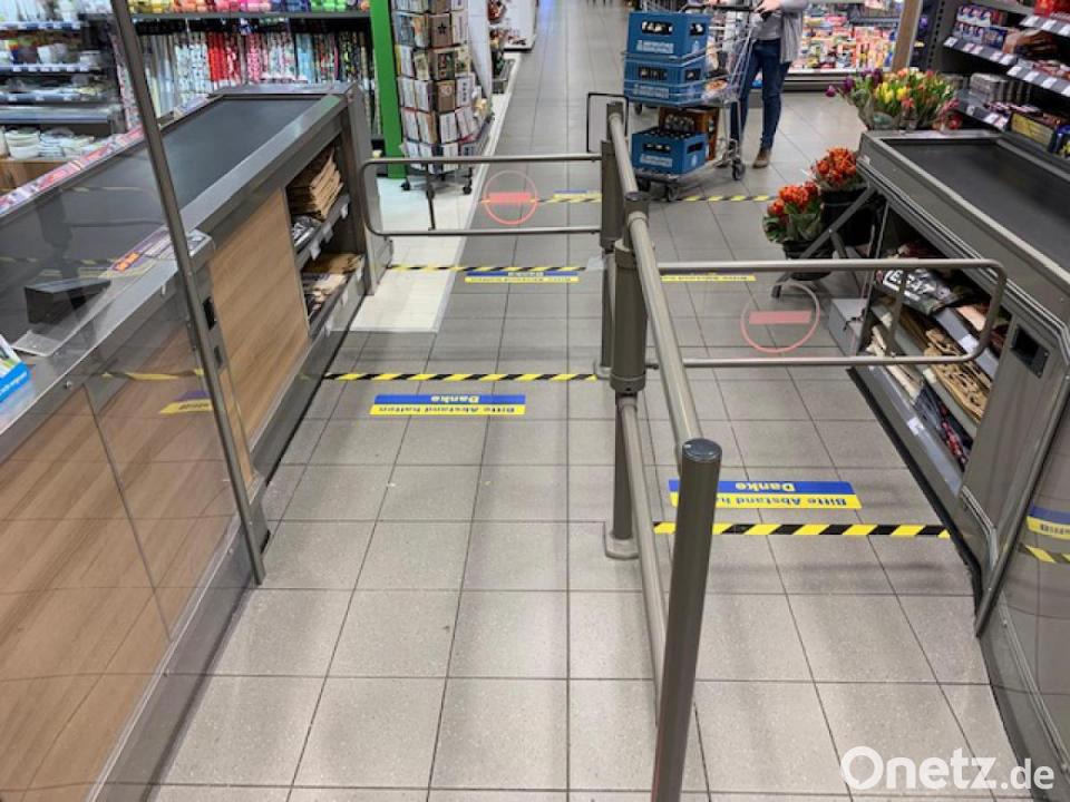 Zum Kundenverhalten sagt sie: Zwar gebe es noch einige wenige Uneinsichtige, die sich beschweren, "wenn Klopapier aus ist". Aber dem werde freundlich begegnet. "Wir bekommen täglich neue Lieferungen. Keiner muss auf etwas verzichten", betont Andrea Fürst. Sollte ein Kunde Hamsterverhalten an den Tag legen, werde dieser entsprechend darauf hingewiesen, dass dies hier nicht erwünscht sei. Zum Schutz von Mitarbeitern und Kunden sei der Abstand gekennzeichnet. "Wir haben Mundschutz, Handschuhe und Desinfektionsmittel." Kerstin Müller bedient an der Kasse seit Tagen so die Kunden. Am Dienstag hat sich eine kleine Schlange an Kunden bei ihr gebildet. Vier Leute wollen zahlen, alles auf Abstand. Am Fußboden hat Andrea Fürst auch Abstandshalter aufgeklebt.