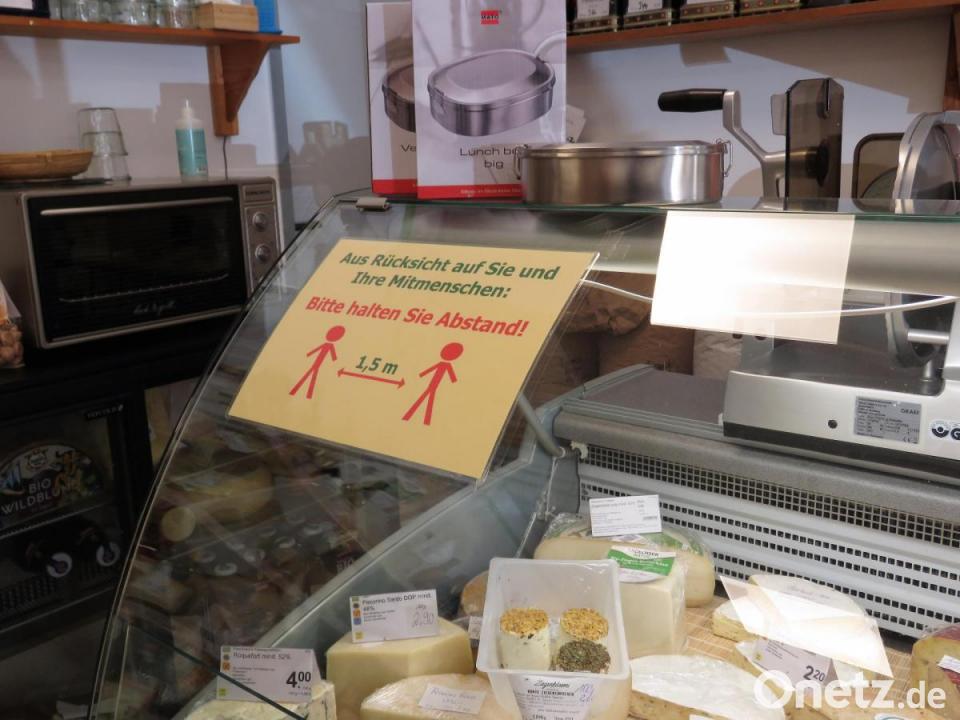 Zwei Holzböcke und eine Glaswand dazwischen: So hat die Chefin des Bio-Ladens "Frohnatur", Roswitha Ulrich, in Tirschenreuth rasch Abhilfe gegen zu viel Nähe zu den Mitmenschen im Laden geschaffen. "Eine Zweite für die Kasse kriegen wir noch", sagt Mitarbeiterin Sibylle Killinger. An der Kasse, an der Brotausgabe und am Käseregal kleben freundliche Hinweiszettel mit der Bitte um Rücksicht. Im Bio-Laden ist es an diesem Tag ruhig, die wenigen Kunden lächeln sich freundlich an und gehen zwischen den Regalen wie selbstverständlich sofort auf Abstand.