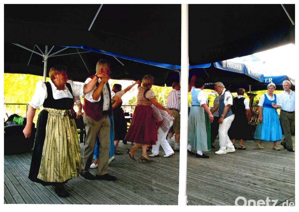 Besser hätte das Wetter nicht sein können für die Veranstaltung "Ein Sommerabend mit Tanzen und Singen am See" der Kreisheimatpfleger. Die Terrasse des Seerestaurants im Fischhofpark bot eine wunderbare Kulisse für den Abend im Freien. Das Volkstanzensemble unter der Leitung von Victor Ehlscheidt am Akkordeon, Wolfgang Trottmann an der Posaune und Bernhard Stock an der Tuba/ Bass spielten zum Tanz auf.