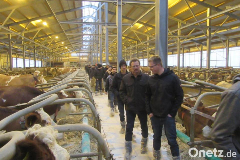 Nach dem Mittagessen besuchte die Gruppe den Betrieb der Familie Adalbert Zölch in Försterhof. Hier konnten die Landwirte einen modernen Milchviehstall mit 240 Kühen in Augenschein nehmen. Die Kühe werden dabei von vier Automatischen Melksystemen in einem ausgeklügelten Stallsystem gemolken. Statt eines herkömmlichen Futtertisches gibt es dort zwei längsseitig verlaufenden Futterbänder. Ein Anbau von Außenliegebuchten mit einem offenen Futtertisch tragen zur Verbesserung des Tierwohls bei.