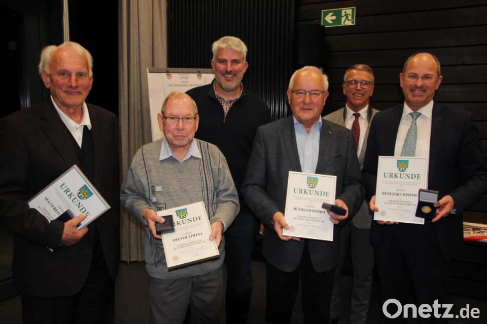 Franz Stahl überreichte anschließend an vier Laufer Bürger, die sich besonders um diese Städtepartnerschaft verdient gemacht haben, die Verdienstmedaille der Stadt Tirschenreuth. Die Verdienstmedaille erhielt der ehemalige Bürgermeister Benedikt Bisping, der von 2008 bis 2020 Stadtoberhaupt von Lauf war. Geehrt wurde auch Rüdiger Pompl, er war von 1979 bis 2008, also fast 30 Jahre, Bürgermeister. Ferner erhielt die Medaille Manfred Scheld, der von 1986 bis 2014 Zweiter oder Dritter Bürgermeister war. Der Vierte im Bunde war Dieter Zölfel, der sich über Jahrzehnte um die Organisation der Fußballspiele gekümmert hat.