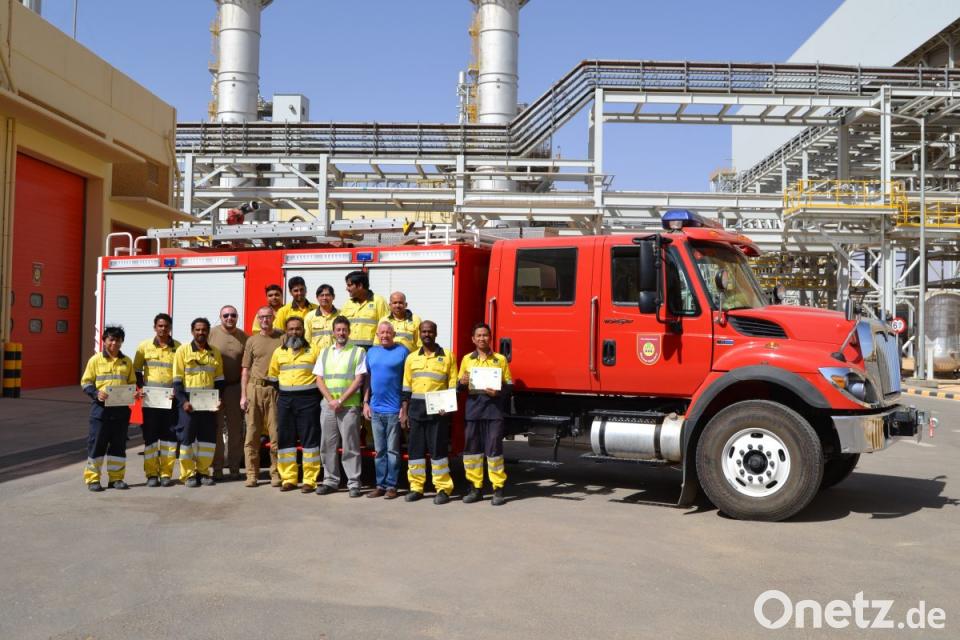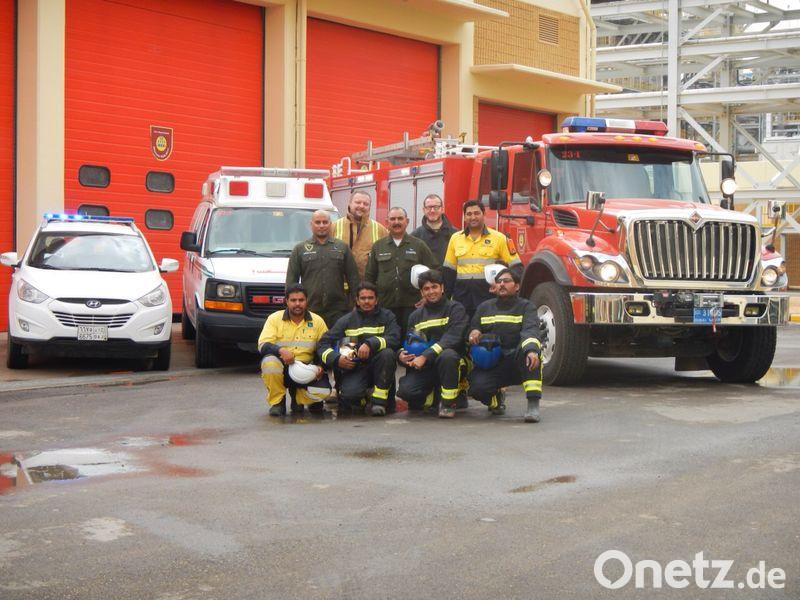 Seither arbeitet Schenk unter der gleißenden arabischen Sonne mitten in der Wüste bei 55 Grad im Sommer. „Man versucht, die Hitze zu vermeiden“, gesteht er, dass er sich an solche Temperaturen nie gewöhnen werde. Im Winter sei es erträglicher, „mit nur bis 30 Grad“. Als Chef von 25 Mitarbeitern, die aus aller Welt kommen, ist Schenks Arbeitsplatz international angesiedelt. Der gebürtige Tscheche ist Chef einer Truppe von Feuerwehrmännern, die aus Saudi-Arabien, Indien, Pakistan, den Philippinen und Südafrika stammen.