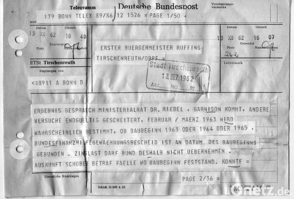 Das Ringen um die Garnison hat Thomas Sporrer bei seinen Recherchen für die neue Tirschenreuther Stadtchronik, die im Herbst 2020 erscheinen soll, nachgezeichnet. Es gab Anfang der 60er Jahre auch Widerstand gegen den Kasernenbau, und nicht zu knapp. Er fand sogar überregionale Beachtung. So schrieb das Coburger Tagblatt am 4. Februar 1960 unter der Überschrift „Es geht um den Bau einer Kaserne“ folgendes: „Groß war die Überraschung für Bürgermeister Karl Ruffing jedoch, als seine „Untertanen“ – so formulierte es der Redakteur – darüber nicht begeistert waren und in Briefen sogar beim Stadtrat energisch gegen den geplanten Kasernenbau protestierten. Ruffing, der befürchtete, die Vorteile fielen jetzt an die Nachbargemeinde Wiesau, reagierte in einer Sitzung des Stadtrates mit den bezeichnenden Worten: „Wir aber haben die Protestunterschriften. Sie werden in die Chronik der Stadt aufgenommen, auf dass einmal unsere Nachfahren wissen, wer den wirtschaftlichen Aufstieg ihrer Heimatstadt hintertrieben hat!“