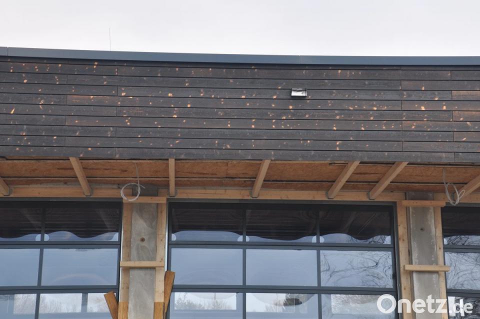 Es sei eben schlicht Natur, die hier ihre Finger im Spiel hätte. Und im Laufe der Zeit würden diese hellen Stellen nachdunkeln, also zunächst grau und dann schwarz werden. Wie halt bei Scheunen, die aus Fichtenholz gebaut sind, verweist der Architekt auf allgemein bekannte Konstruktionen. Die derzeitigen Flecken in der Holzverkleidung außen am neuen Feuerwehrhaus bringen den Planer nicht aus der Fassung. Das sei durchaus normal, attestiert der Fachmann und verweist auf den Vorgang der Karbonatisierung, der zum "besten Schutz" der Bretter angewandt worden sei. Dabei würden die Bretter im industriellen Vorgang "beflammt" und somit optimal geschützt.
