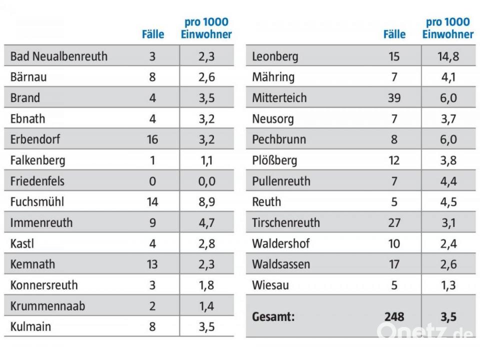 Bezogen auf die Einwohnerzahlen hatte Leonberg den größten Zuwachs an Corona-Fällen: 15 Infektionen in einer Woche bedeuten 14,8 pro 1000 Menschen. Ebenfalls überproportional ist die Steigerung in Fuchsmühl mit 14 Fällen (8,9 pro 1000 Einwohner). Insgesamt registrierte man im Landkreis 248 Corona-Infektionen, was einem Schnitt von 3,5 pro 1000 Leuten entspricht.