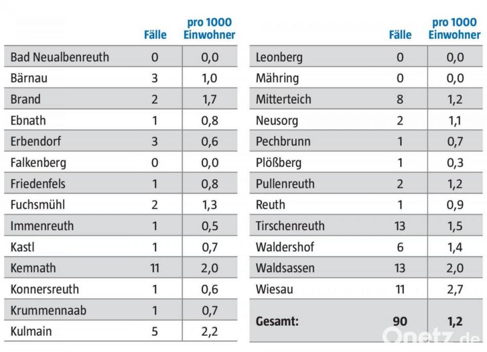 Vier Orte waren in der vergangenen Woche coronafrei: Bad Neualbenreuth, Falkenberg, Leonberg und Mähring. Die meisten neuen Fälle gab es in Tirschenreuth, Waldsassen (jeweils 13), Kemnath und Wiesau (jeweils 11). Umgerechnet auf die Gemeindegröße haben Wiesau (2,7 Fälle pro 1000 Einwohner) und Kulmain (2,2) die höchsten Inzidenzen.