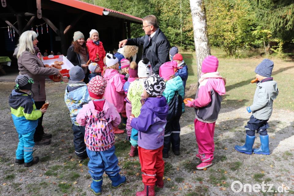 Raus aus den vier Wänden, rein in die Natur. Im Rahmen der Waldprojekttage sind die Vorschulkinder des städtischen Kinderhauses "Kunterbunt" eine Woche zu Gast bei der Forstdiensthütte. Eine aufregende Zeit, in der die Mädchen und Jungen viel erleben. Sie schmücken ihren Lieblingsbaum mit bemalten Holzscheiben, gestalten Zauberstäbe, gehen auf Pilzsuche – und suchen mit Stadtförster Stefan Gradl nach Tierspuren. Klar, dass viel Bewegung in frischer Waldluft besonders hungrig macht. Somit löste Bürgermeister Franz Stahl besondere Freude aus, als er die kleinen und großen Forscher mit einer Brotzeit überraschte.