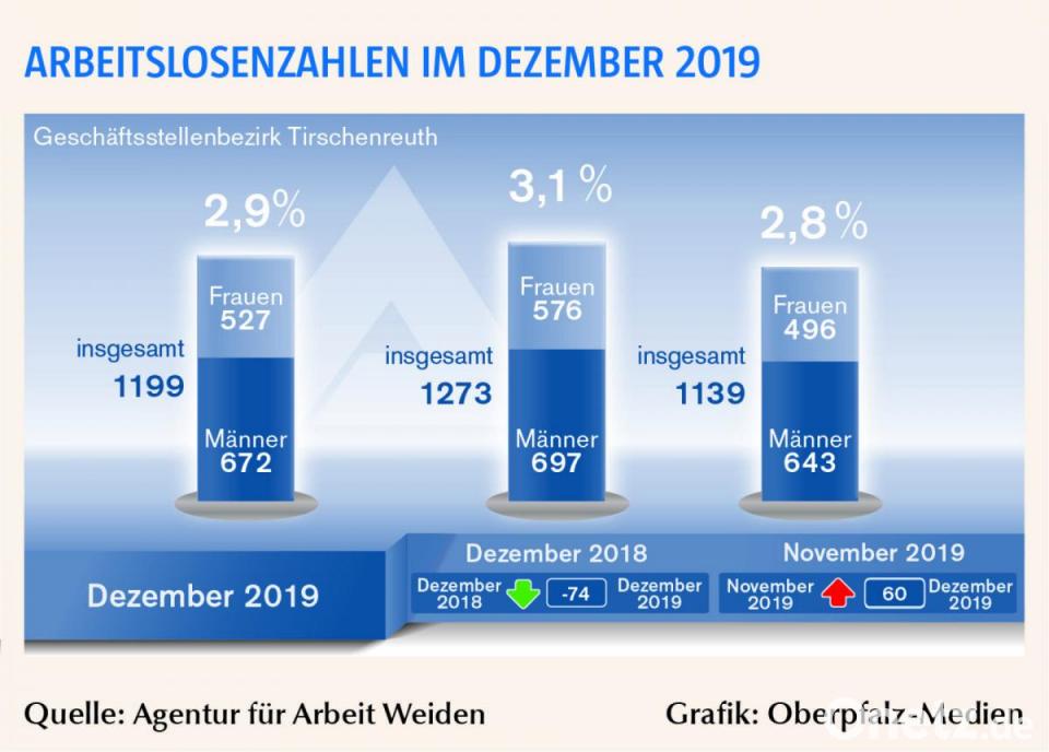 Das Jobcenter Tirschenreuth vermeldete dagegen einen starken Rückgang gegenüber Dezember 2018 um 17,5 Prozent bei den hilfebedürftigen Arbeitslosen. Es ist für 538 Arbeitslose erster Ansprechpartner. Laut Geschäftsstellenleiter Franz werden sich in den nächsten Wochen weiterhin Arbeitnehmer aus witterungsabhängigen Branchen arbeitslos melden, die oftmals bereits eine Wiedereinstellungszusage für das Frühjahr besitzen. Aufgrund der stabilen Wirtschaftsprognosen und dem hohen Personalbedarf der Betriebe rechnet Franz mit einem stabilen Arbeitsmarkt. Ein Indiz für den hohen Personalbedarf sind die 26 508 sozialversicherungspflichtig Beschäftigten im Landkreis. Das ist eine Zunahme um 2,7 Prozent gegenüber dem Vorjahresquartal. Der Anstieg der Beschäftigung bewirkt einen wachsenden Bedarf an Fachkräften. Dies bestätigt auch der Arbeitgeber-Servic. 658 Stellenangebote meldeten die Unternehmen in der Region.
