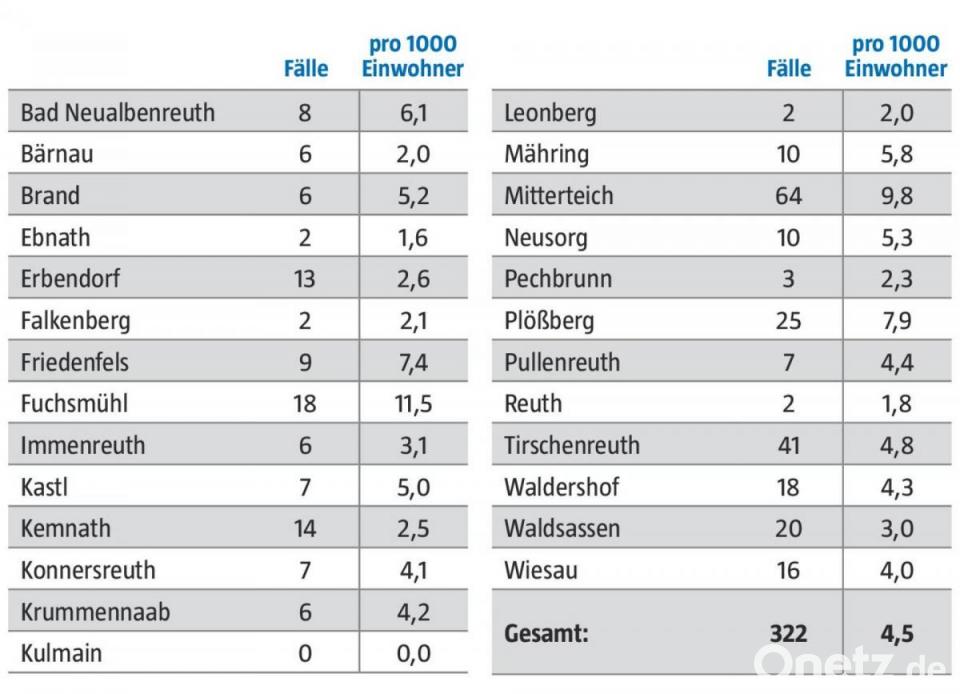 Die meisten neuen Fälle gab es, wie in der Vorwoche, in Mitterteich. Von dort wurden 64 Corona-Infektionen gemeldet. 41 waren es in Tirschenreuth, 25 in Plößberg und 20 in Waldsassen. Bezogen auf die Einwohnerzahlen, hatte Fuchsmühl den größten Zuwachs an Corona-Fällen: 18 Infektionen in einer Woche bedeuten 11,5 pro 1000 Menschen. Insgesamt registrierte der Landkreis 322 Corona-Infektionen, was einem Schnitt von 4,5 pro 1000 Leuten entspricht.