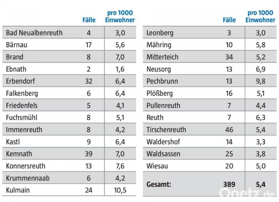 Die meisten neuen Fälle gab es in den vergangenen sieben Tagen in Tirschenreuth. Von dort wurden 46 Corona-Infektionen gemeldet. 39 waren es in Kemnath. In Mitterteich gab es 34 und in Erbendorf 32 neue Fälle. Bezogen auf die Einwohnerzahl hatte die Gemeinde Kulmain den größten Zuwachs an Corona-Fällen. 24 Infektionen in einer Woche bedeuten einen Wert von 10,5 pro 1000 Menschen. Die 7-Tage-Inzidenz des Landkreises bezogen auf 100 000 Einwohner lag am Freitag laut Corona-Dashboard bei 544, am Samstag steigt der Wert voraussichtlich leicht auf 547. Der Blick in die Nachbarlandkreise zeigt ein ähnliches Bild. Aus dem Landkreis Wunsiedel wurde am Freitag eine 7-Tage-Inzidenz von 411 gemeldet, in Neustadt/WN lag die Inzidenz bei 549, in Weiden bei 553 und im Landkreis Bayreuth bei 429.