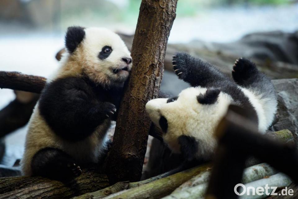 Vor Journalisten legten die rund fünf Monate alten Brüder Meng Xiang und Meng Yuan am Mittwoch erste Klettereinlagen hin, fielen dabei aber auch immer wieder um. Ansonsten zeigten sie sich sehr verspielt und rauften auch miteinander.