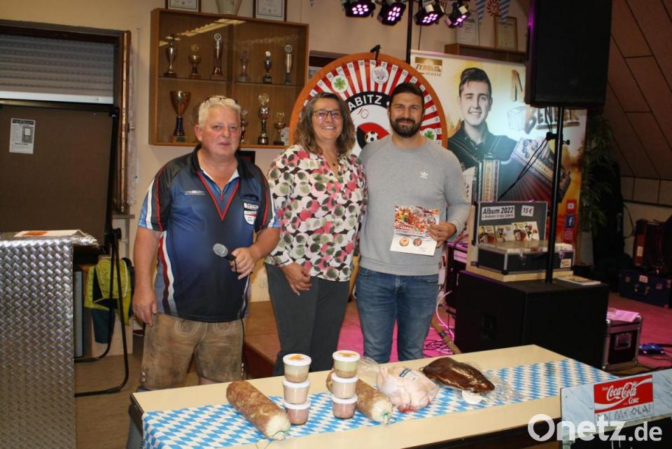 „Wir sind zufrieden ohne Ende“, freute sich Förderkreisvorsitzender und Conférencier Hans-Werner Strehl, der mit seinen schon legendären Sprüchen durch den Abend führte und die Losverkäufer anspornte: „Bringt's a Geld eina für unsere kleinen Fußballspieler.“ Denn auch heuer galt: Der Erlös aus dem Losverkauf kommt den Trabitzer Nachwuchskickern zugute. Besonderen Grund zur Freude hatte Berthold Lautner aus Kulmain. Ihm erdrehte Bürgermeisterin Carmen Pepiuk als eine der „Glücksfeen“ den Hauptpreis – einen vom Stammtisch „Bauwagen Trabitz“ gestifteten 150-Euro-Gutschein der örtlichen Metzgerei. Ein Gast aus Waldthurn wiederum lag beim traditionellen Schätzspiel, bei dem das Gewicht eines 4160 Gramm schweren Stückes Geräucherten erraten werden musste, nur 20 Gramm daneben und durfte den deftigen Leckerbissen mitnehmen.