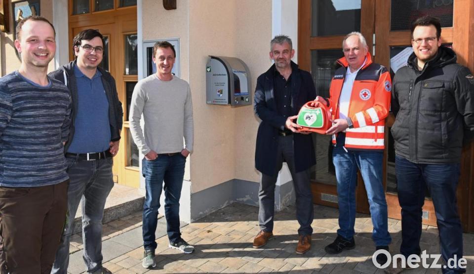 BRK-Rettungsdienstleiter Erwin Gräml (Zweiter von rechts) übergab am Montag zwei Defibrillatoren an Bürgermeister Roger Hoffmann (Dritter von rechts). Die Geräte hängen künftig am Feuerwehrhaus in Traßlberg und an der Bushaltestelle in Altmannshof. Weiter auf dem Bild (von links) JU-Vorsitzender Markus Weiß, Manfred Hofmann und Benedikt Grünbauer sowie (rechts) CSU-Gemeinderat Johannes Hauer.