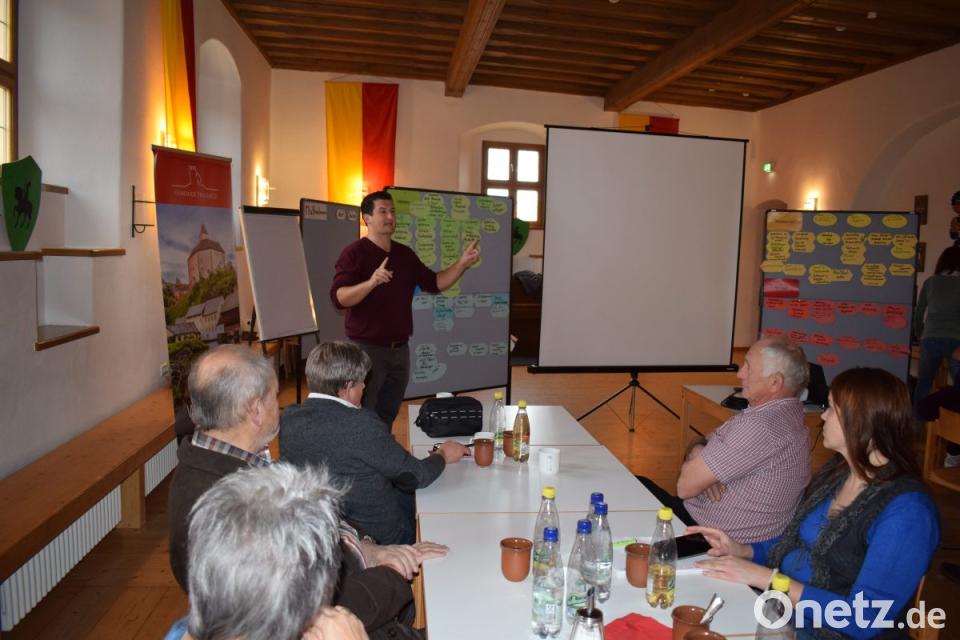 Bereits im ersten Anlauf folgten 32 Bürger der Einladung in den historischen Rittersaal der Burg. Über fünf Stunden diskutierten die Teilnehmer über die verschiedensten Themen – eine Vorgabe gab es nicht ‒ und brachten ihre Vorschläge zu Papier. Damit die Sache übersichtlich blieb und auch jeder zu Wort kam, wurden die Teilnehmer in vier Gruppen eingeteilt, die unabhängig voneinander ihre Vorschläge erarbeiteten. Im ersten Schritt ging es darum, die Stärken und Schwächen der Gemeinde aufzuzeigen und die Möglichkeiten und Risiken zu bewerten. Im zweiten Schritt waren dann konkrete Maßnahmen zu definieren und die Möglichkeit der Umsetzung zu bewerten. Ein erstes Ergebnis wird in der Bürgerversammlung am 22. November im „Das Landhaus“ vorgestellt.
