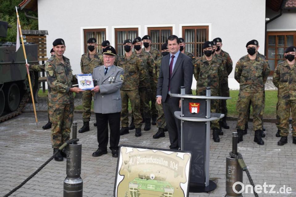 Heute hat sich die politische Lage geändert und Auftrag und Struktur der Bundeswehr sind ganz anders ausgerichtet. Darauf ging der Kompaniechef, Major Maximilian Ritter, in seiner Ansprache ein. „Dies änderte jedoch nichts daran, dass die Bundeswehr nach wie vor das Verständnis und die Unterstützung der Bevölkerung braucht“, verdeutlichter der Kompaniechef die Bedeutung der Patenschaft. Mit dem Austausch von Urkunden und Plaketten wurde die Patenschaft erneuert.