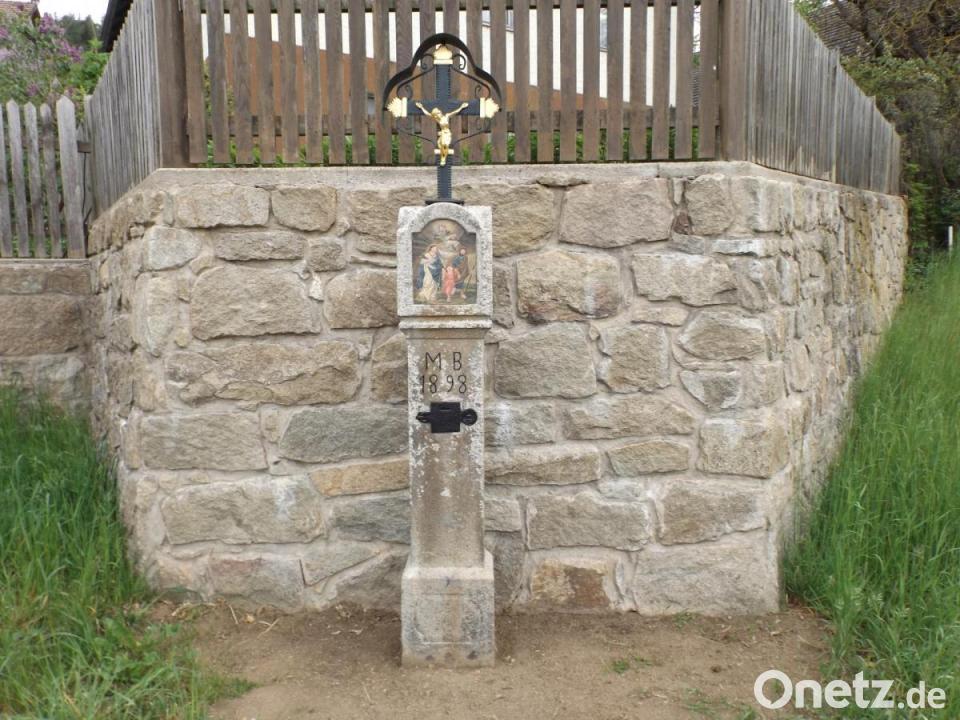 Etwas versteckt und von der Öffentlichkeit wenig beachtet fristete bisher ein Steinmarterl am Brunnenberg in Atzenhof sein Dasein. Warum es errichtet worden ist oder wer sein Erbauer war, bleibt bis heute ein Rätsel. Die beiden Buchstaben MB und die Jahreszahl 1898 geben wenige Hinweise auf die Intention. Auf der Bildtafel ist die heilige Familie dargestellt, die von einem Kreuz besonders herausgehoben wird. In die Steinsäule ist zudem ein Opferstock eingearbeitet, der sogar einige Münzen aus der D-Mark-Zeit enthielt. Alfons Braun, dessen Hofstelle sich in unmittelbarer Nähe befindet, war es ein besonderes Anliegen, den Bildstock wieder in einen ansehnlichen Zustand zu versetzen. Mit dieser Aufgabe wurde der Trausnitzer Kunstmaler Reinhold Hauer betraut, der den Bildstock farblich neu fasste und das Kreuz mit einer Goldauflage versah. Die Ortschaft Atzenhof dankt den beiden Gönnern für den Erhalt dieses sakralen Kleinodes.