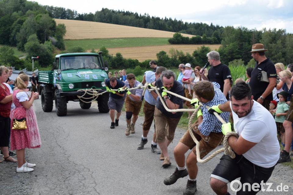 An zwei Stationen konnten sich die Kinder im Schminken üben oder kleine Geschenke basteln. Gruppenleiterin Renate Schönberger und ihre Helferinnen hatten alle Hände voll zu tun, so groß war der Andrang. Aber nicht nur für die Kinder, auch für die Erwachsenen stand ein Highlight an. Die Vereinsgemeinschaft suchte beim Unimog-Wettziehen ihre stärksten Männer. Es bedurfte schon einer riesigen Kraftanstrengung, das 3,5 Tonnen schwere Gefährt eine leicht ansteigende Straße hochzuziehen. Sechs Mannschaften wollten es genau wissen, wer die Stärksten sind. Unter den Anfeuerungsrufen der Zuschauer gaben die Kraftsportler ihr Bestes.