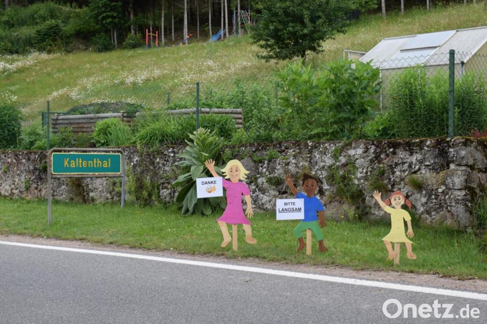 Bereits des öfteren haben die Einwohner von Kaltenthal die Verlegung des Ortsschildes von Trausnitz an den Eingang von Kaltenthal beantragt, um so eine Geschwindigkeitsbegrenzung auf 50 Stundenkilometern zu erreichen. Gesetzliche Vorgaben stehen dem aber entgegen. So blieb den Einwohnern nichts anderes übrig, als zur Selbsthilfe zu greifen. Mit selbstgebastelten und liebevoll gestalteten Hinweisschildern bitten sie die Verkehrsteilnehmer um besondere Rücksichtnahme.