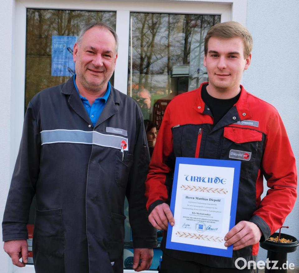 Nach der Auszeichnung als Schulbester der Europa-Berufsschule Weiden im Ausbildungsberuf des Kfz-Mechatronikers freut sich Matthias Diepold mit seinem Vater und Lehrherrn Andreas Diepold über die Ehrung der Kfz-Innung Regensburg. Wegen der Corona-Krise gibt es keinen Festakt in der Bezirkshauptstadt. Stattdessen dürften die Firmenchefs die Urkunden überreichen.