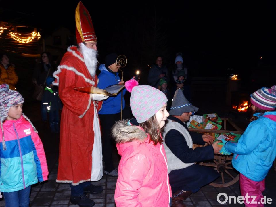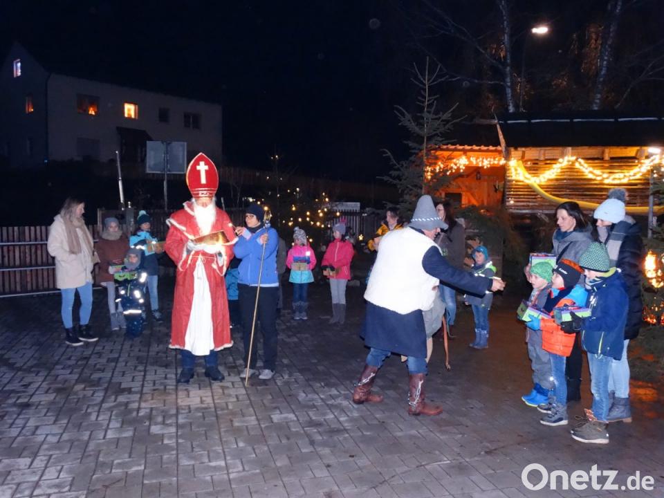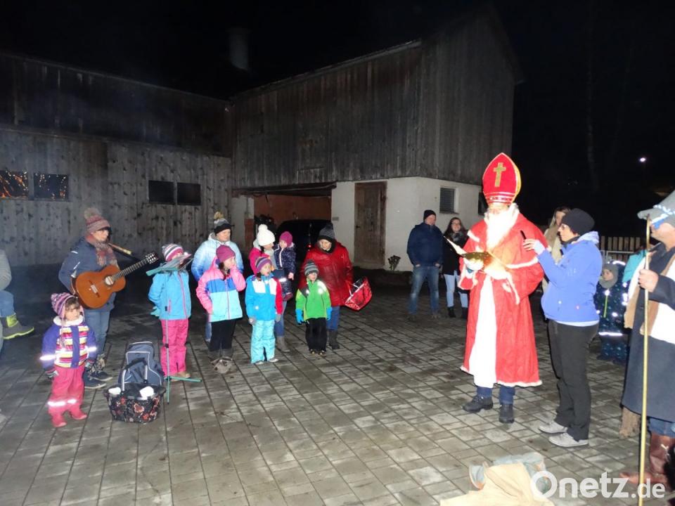 Die Kleinen sangen weihnachtliche Lieder. Marina Fenzl begleitete sie auf der Gitarre. Plötzlich kamen aus der Dunkelheit zwei bekannte Gestalten. Der Heilige Nikolaus in seinem roten Gewand und Knecht Rupprecht schritten zu den Kindern, die bereits sehnsüchtig auf sie gewartet hatten.