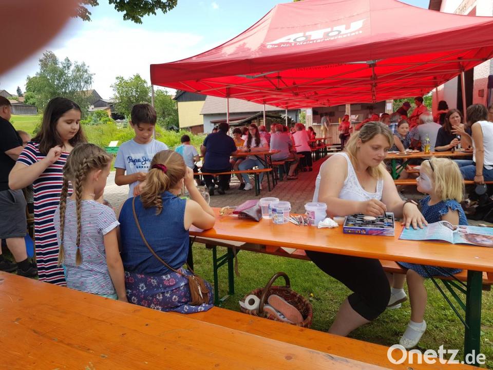 Auch an den Nachwuchs wurde gedacht. So wurde Kinderschminken, Schaukeln am angrenzenden Spielplatz und Feuerwehrspielen geboten. Vorsitzender Franz Feneis nahm die Gelegenheit wahr und überreichte vom SKC Stammtisch Tröbes an die Leiterin Veronika Janda 200 Euro für den Kindergarten. Die sich herzlich dafür bedankte. Als der Regen aufkam, wurde im Feuerwehrhaus bis tief in die Nacht hinein weiter gefeiert.