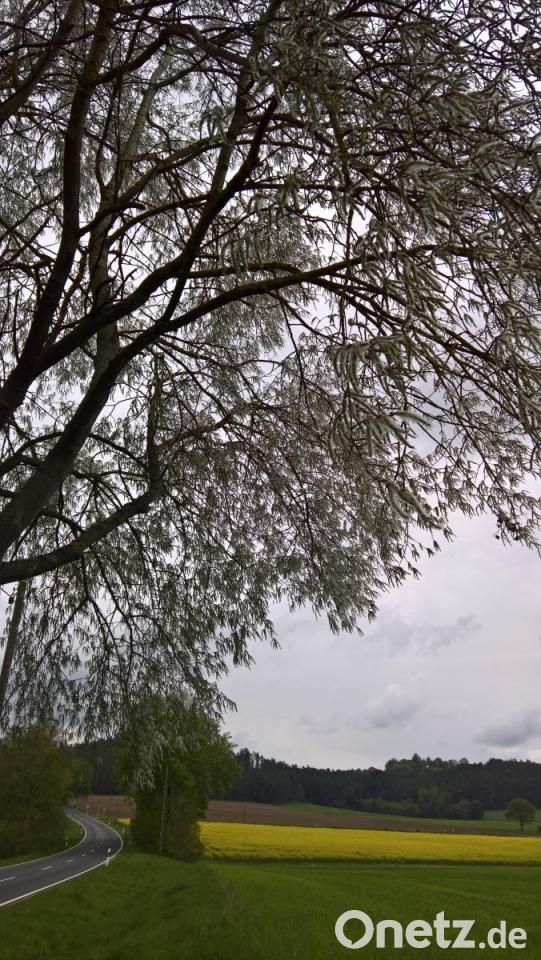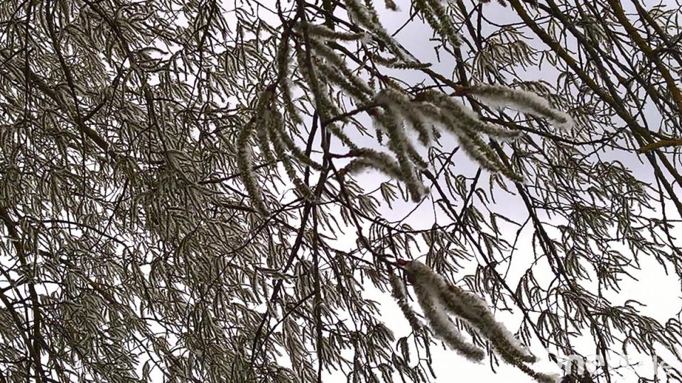 Die Bäume blühen nicht und wirken, als wären sie von einem Gespinst überzogen. Dem ist aber nicht so.Wahrscheinlich ausgelöst durch die sehr früh warmen Temperaturen und fehlendem Regen, haben sich die Weidenblüten zu langen Samenständen ausgebildet. Das flauschige Flughaar hat der Regen nicht zerdrückt und ist für das helle Erscheinungsbild verantwortlich.
