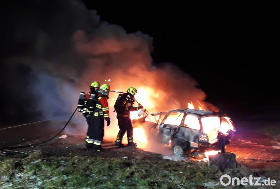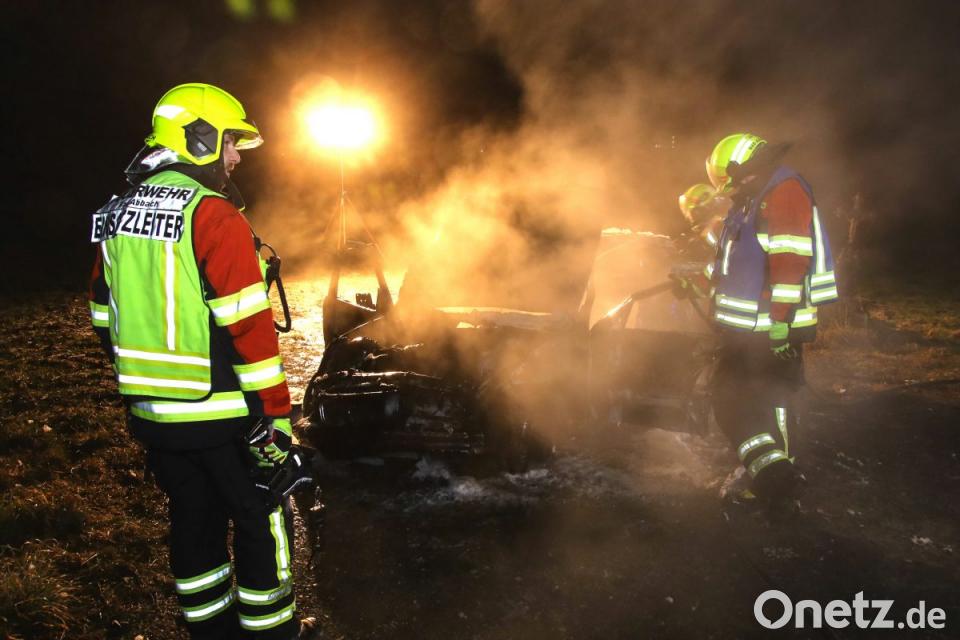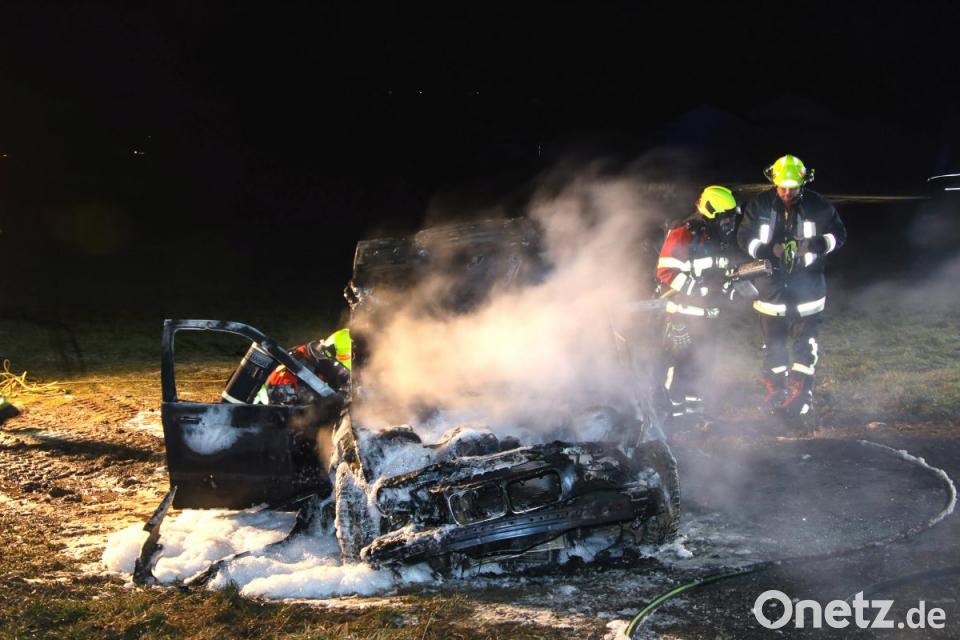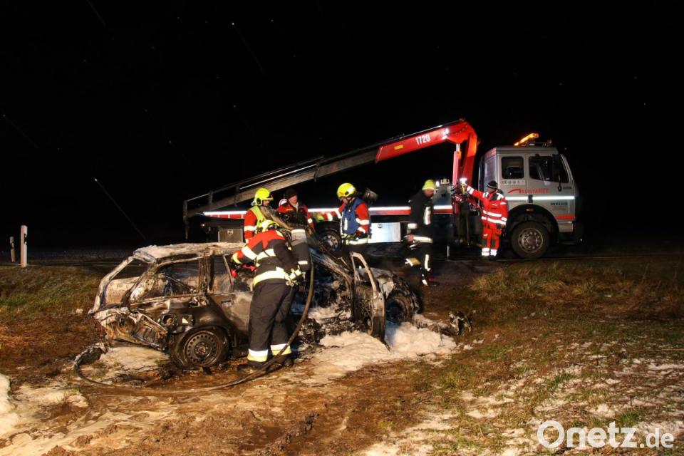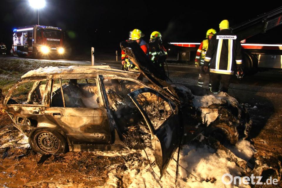 Nur wenige Stunden später erreichte die freiwillige Feuerwehr ein weiterer Hilferuf. Auf der Ortsverbindungsstraße zwischen Bad Abbach und Peising brannte ein Pkw. Wie den Einsatzkräften mitgeteilt wurde, handelte es sich um ein Auto, das auf einen Abschleppwagen geladen wurde. An der Einsatzstelle angekommen, erwartete die Feuerwehr eine Überraschung. Derselbe Pkw, aus dem sie zuvor den Fahrer geborgen hatten, hatte nun wohl beim Verladen auf den Kranwagen Feuer gefangen. Dem Abschlepp-Fahrer war es noch gelungen, den brennenden BMW wieder abzuladen und seinen Kranwagen in Sicherheit zu bringen. Der BMW brannte vollständig aus.