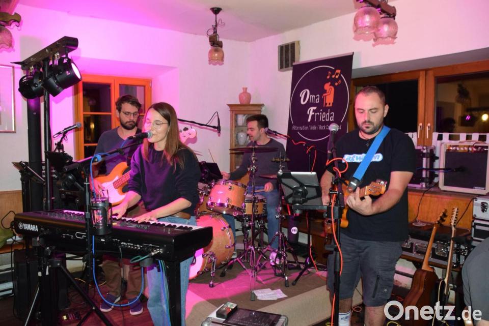 "Oma Frieda" sang und spielte Lieder von den Beatles, „The Police“, Oasis und etlichen anderen bekannten Interpreten. Katrin Heidner stand dabei am Keyboard. Sie ist Klavierpädagogin, Sängerin und Chorleiterin, was man auch hörte. Daneben waren Dominik Herzner am Bass und Jan Heidner am Schlagzeug zu hören. Als hervorragender Gitarrist und Leadsänger überzeugte Timo Pleisteiner.