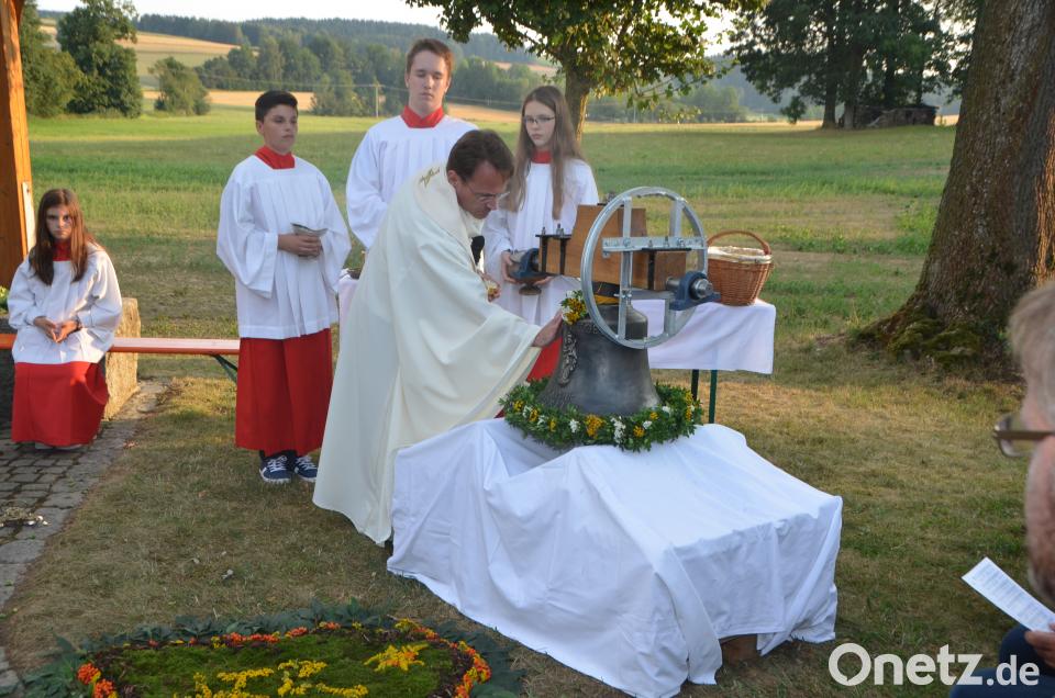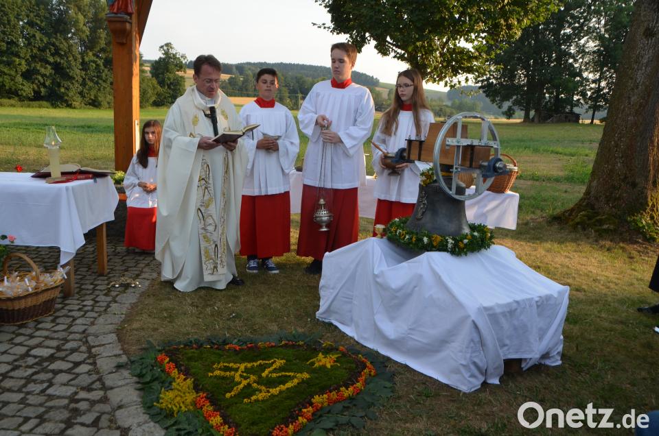 (dob) Die Glockenweihe am Samstagabend vor dem Dorfkreuz gerät zu einem Sinnbild für die feste Dorfgemeinschaft. Die sommerlich geschmückte Hüterin der Zeit, die neue 40 Kilogramm Glocke, steht inmitten des aufgebauten Altarraums hinter einem leuchtenden kleinen Blütenteppich, den Anita Hirmer ihr zu Ehren legte, und wartet auf die Weihe. Die Glocke wurde in der Glocken- und Kunstgießerei Anton Gugg in Straubing als „Regina coeli“ gegossen.