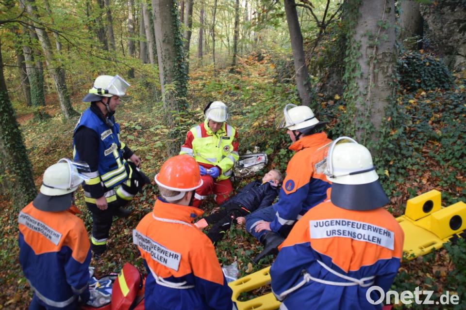 Lange hielt die Ruhe für die 15 Jugendlichen nicht an: Schon hieß es „Einsatz für die Feuerwehr Ursensollen“. Das erste Alarmstichwort lautete: „Unterstützung des Rettungsdienstes. Eine verunglückte Person ist in unzugänglichem Gebiet.“
