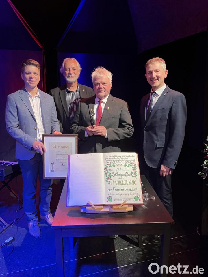 Bürgermeister Albert Geitner gratulierten dem Geehrten zusammen mit seinen Stellvertretern Norbert Mitlmeier und Achim Kuchenbecker zur Ehrenbürgerwürde, überreichte ihm die Bürgerskulptur Honoria, eine Anstecknadel und eine Urkunde. Als Ehrenbürger durfte sich Johann Schmaußer auch in das Goldene Buch der Gemeinde Ursensollen eintragen.
