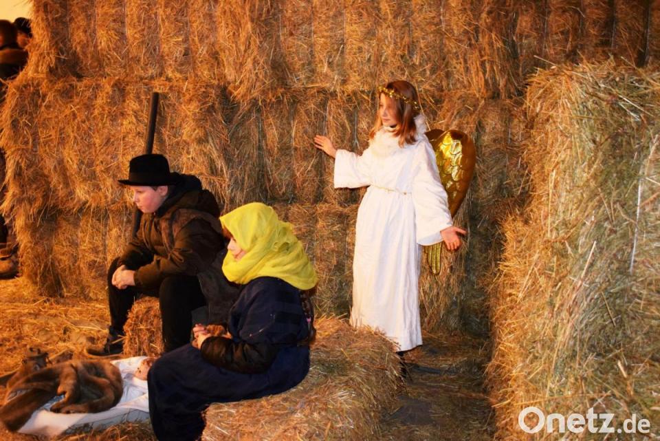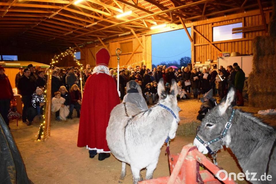 Eine kluge Entscheidung war die Verlegung in die Niebler Halle, die von einem Aufbewahrungsort für Strohballen und landwirtschaftliche Geräten in eine Bühne für die Waldweihnacht umfunktioniert wurde. So schonte man die Waldwege und die Besucher hatten trockene Füße.Zwischen großen Strohballen war genügend Platz für das Krippenspiel der Viehberger Kinder. Das Lagerfeuer wurde durch LED-Lichter ersetzt und die Kotzheimer Esel in der Halle erhielten viele Streicheleinheiten von den Kindern.