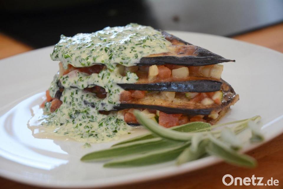 Die Auberginenscheiben auf vier Tellern mit der Zucchini-Tomaten-Mischung wie Lasagne schichten. Mit der Pistou-Sauce überziehen.